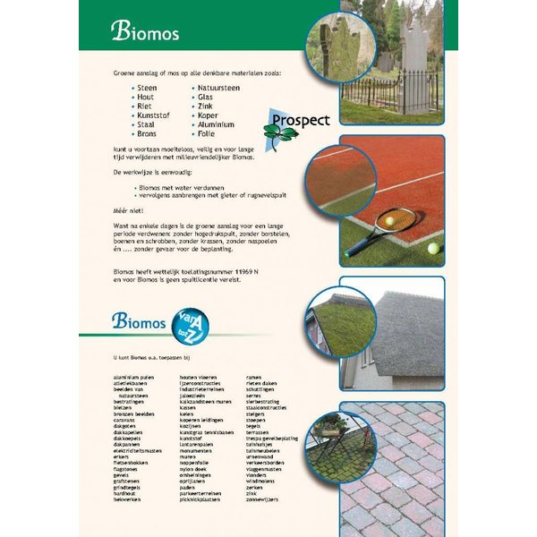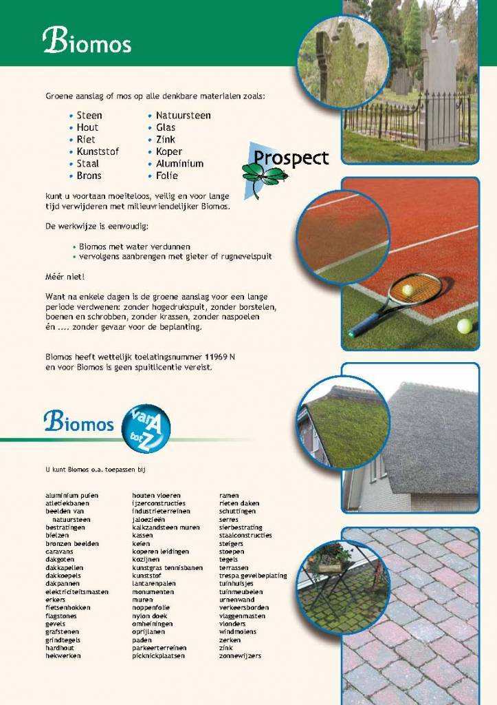 Het professionele product Biomos is uitermate geschikt om zonder gebruik van een hoge drukreiniger of schrobber groene aanslag van algen te verwijderen. Je kunt het op zowat iedere ondergrond gebruiken. Of het nu over je terras, bestrating, balkon, muur of schutting gaat Biomos pakt de vervuiling aan, dood de bacteriën die de groene aanslag vormen en zorgt ervoor dat deze voorlopig niet meer terug komen.